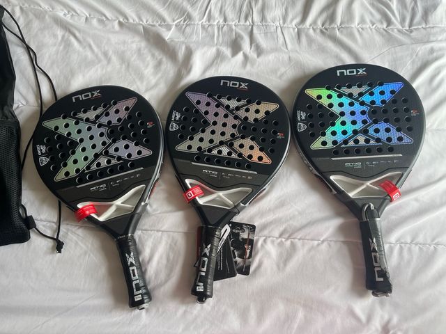 Detalles del productoPala de pádel Nox AT10 Pro Cup Hard con su funda. Tengo 3 palas. Como se puede ver en las fotos todas incluyen su su certificado de calidad y siguen precintadas. El precio puesto es por pala.