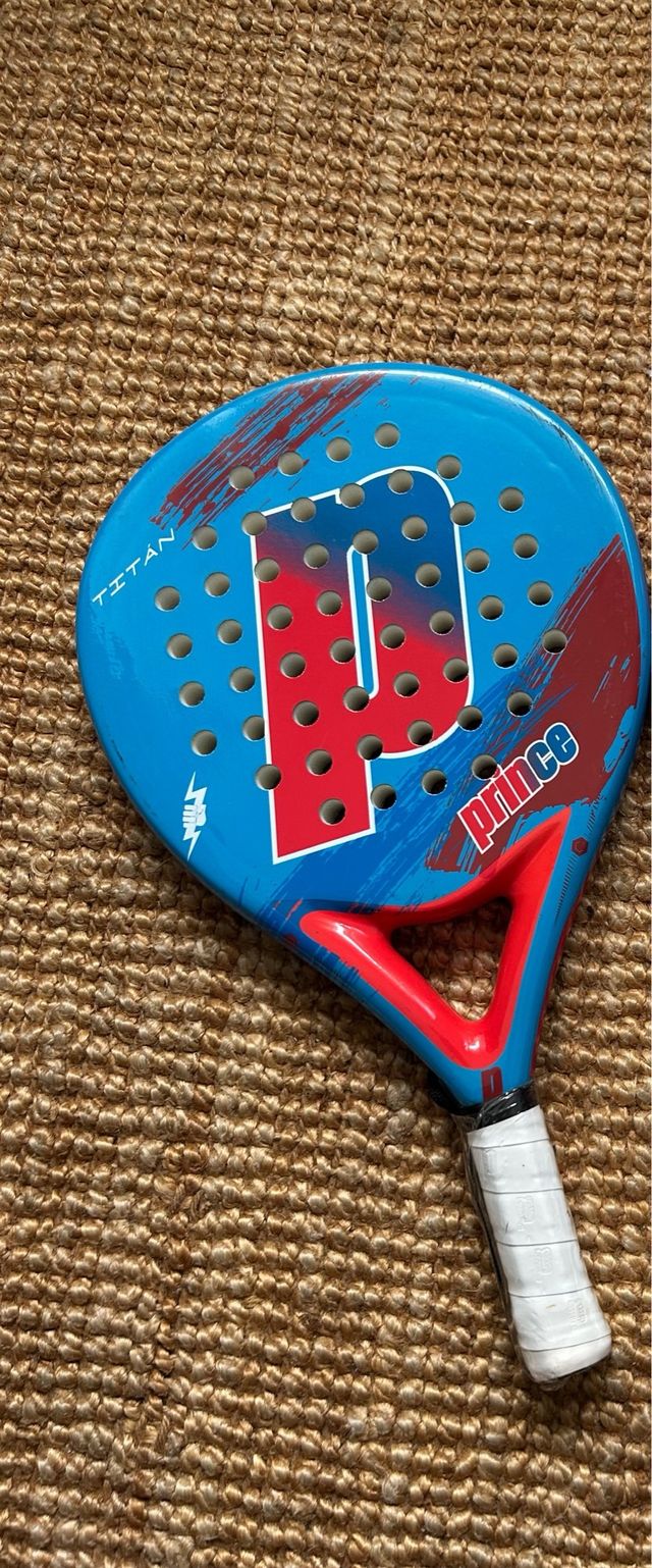 Detalles del productoPala de pádel Prince Titan, ideal para niños. Diseñada con un llamativo acabado en azul y rojo.