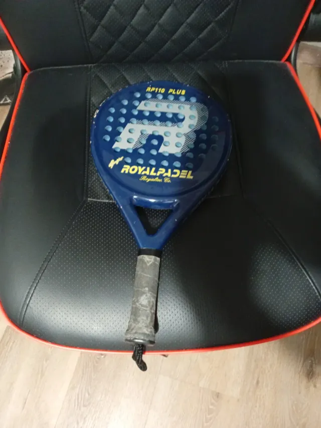 Pala de pádel Royal Pádel modelo RP110 PLUS. - Pala de pádel azul. - Logo de Royal Pádel en blanco y plateado. - Grip gris desgastado.