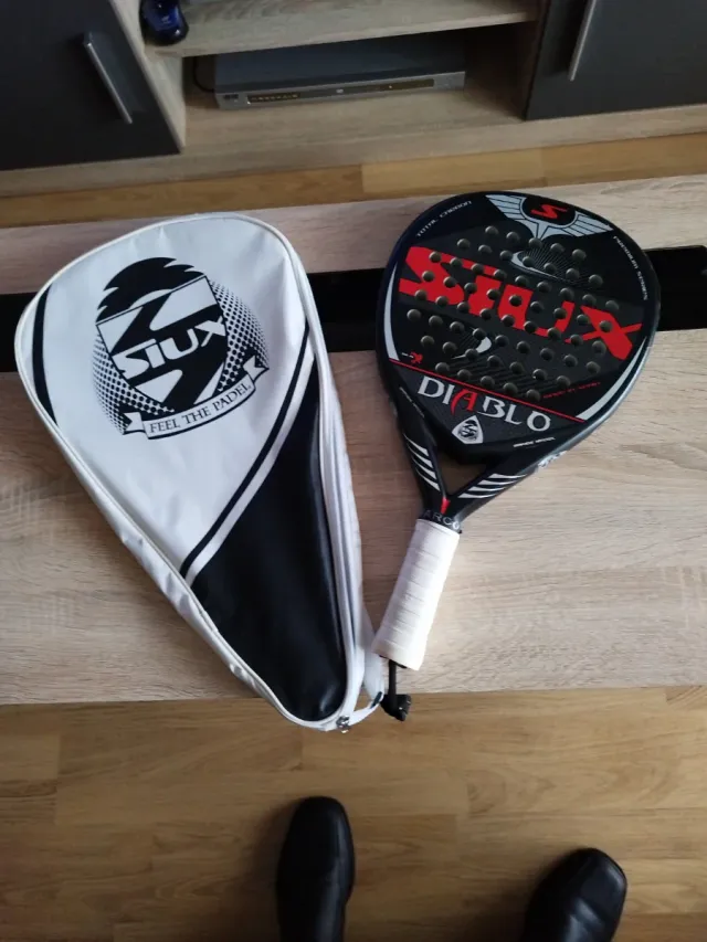 Pala de pádel Siux Diablo Graphene con funda. - Pala de pádel de alta gama. - Diseño moderno en negro y rojo. - Incluye funda protectora.