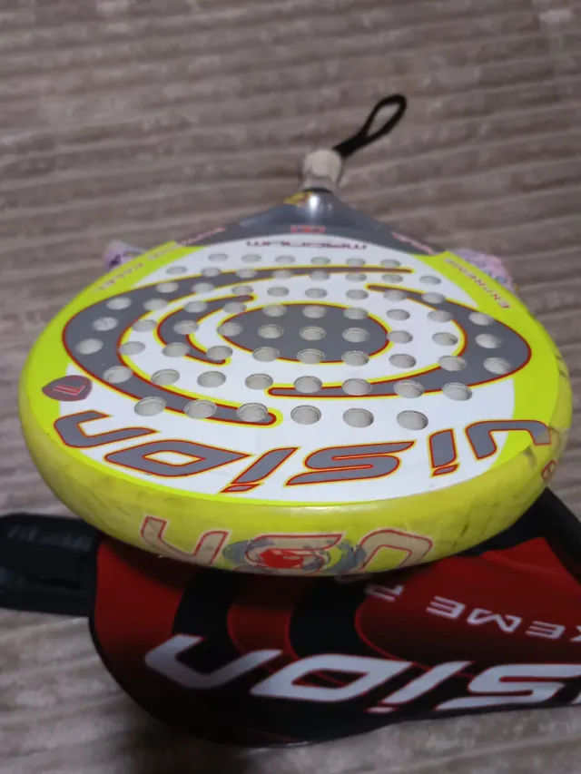 Pala de pádel Vision Magnum con un diseño llamativo en amarillo y gris. Incluye funda. - Pala de pádel Vision Magnum. - Funda de regalo.