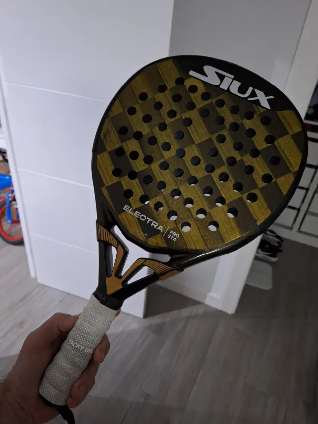 Pala de pádel Siux Electra Pro ST4 con un diseño llamativo en negro y dorado. - Superficie con acabado mate. - Marco de carbono. - Empuñadura Tacky Grip.