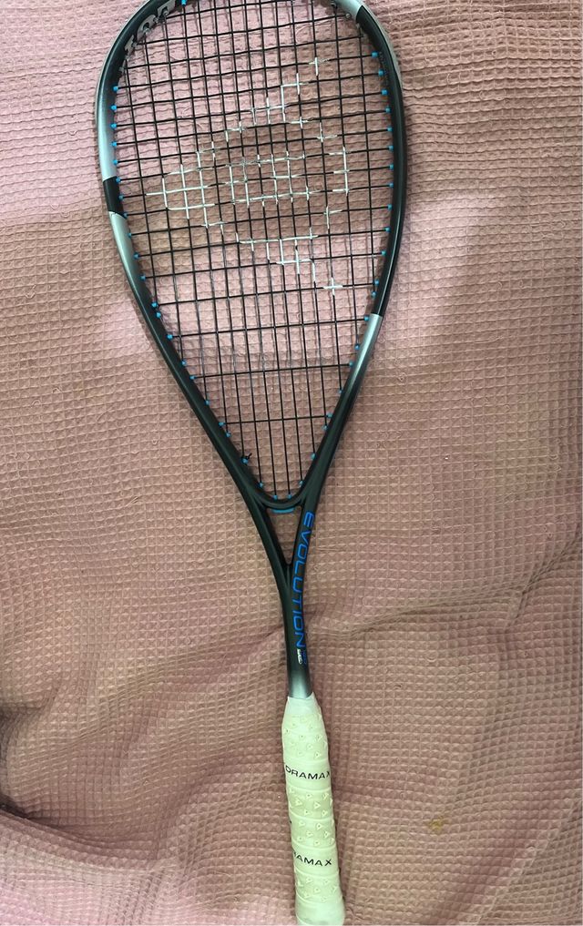 Pala de squash Dunlop Sonic Core Evolution. - Diseño moderno en color gris y azul. - Empuñadura blanca con logo. - Cordaje negro con detalles azules.