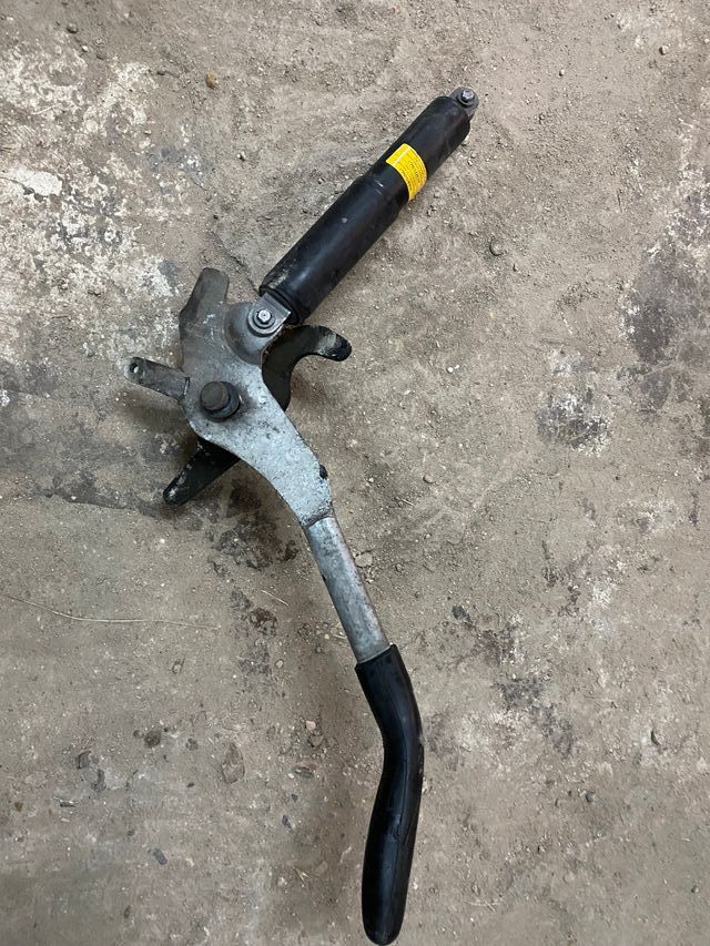 Detalles del productoPalanca de freno para remolque con amortiguador integrado. Pieza metálica con empuñadura de goma negra.