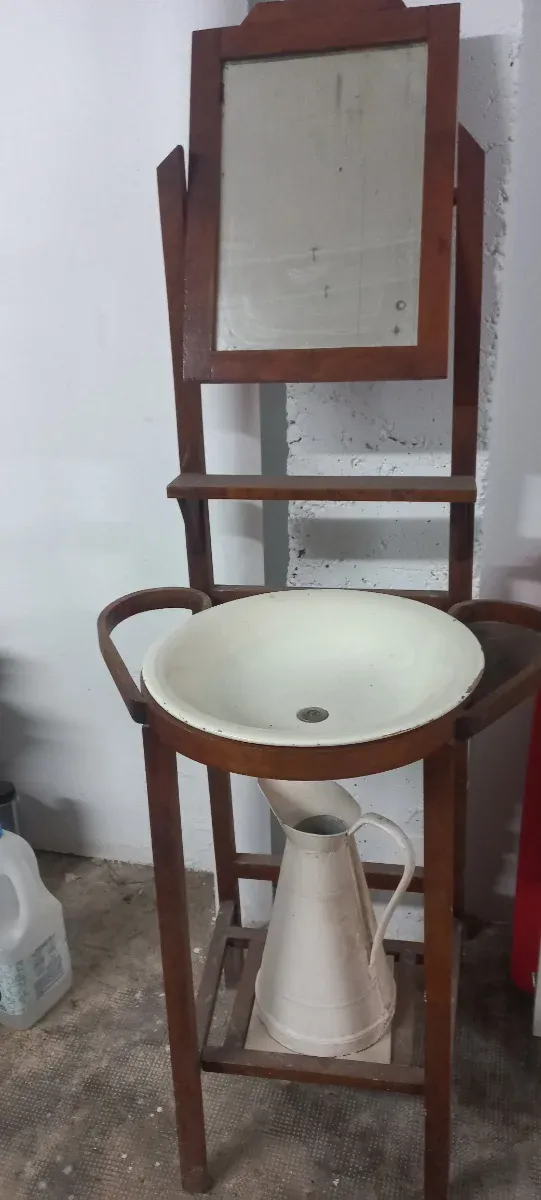 Palanganero antiguo de madera con lavabo y espejo. - Estructura de madera. - Lavabo de cerámica blanco. - Espejo basculante. Vendo en persona.