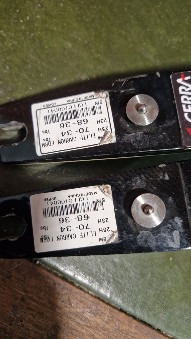 Palas de arco olímpico Elite Carbon Form. - Modelo: EM - Peso: 70-34 lbs (25H) y 68-36 lbs (23H) - Fabricado en China - Número de serie: IGEEC700041