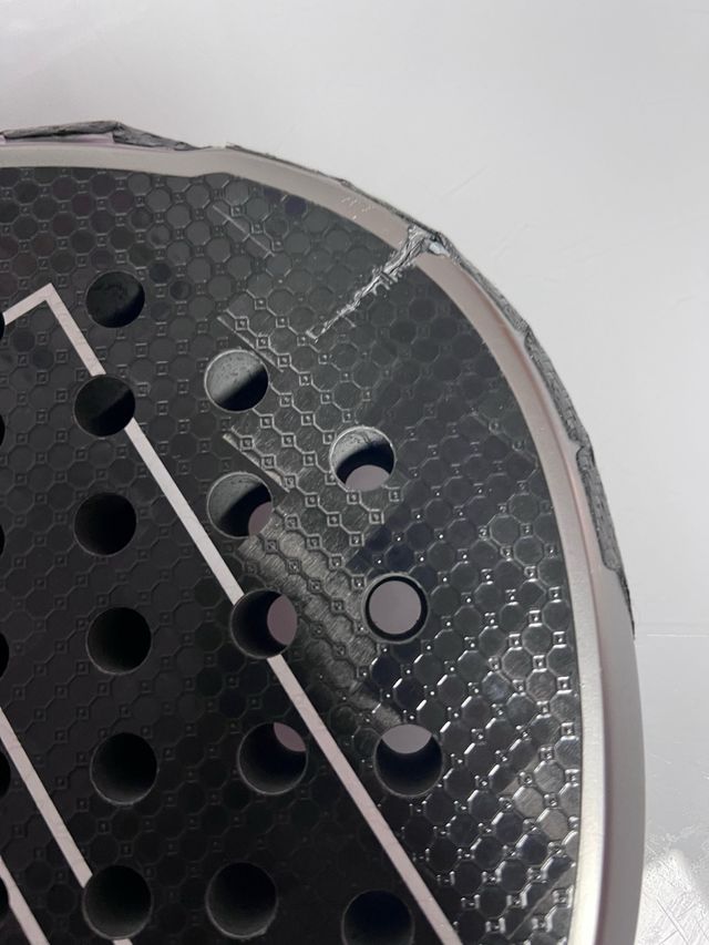 Palas de pádel con daños visibles en el marco. - Superficie con patrón hexagonal. - Agujeros circulares en la cara de golpeo. - Detalle de rotura en el borde superior.