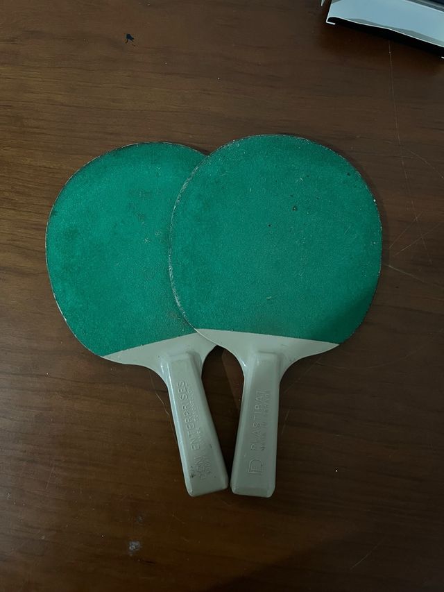 Detalles del productoSet de dos palas de ping pong con superficie de juego verde.
