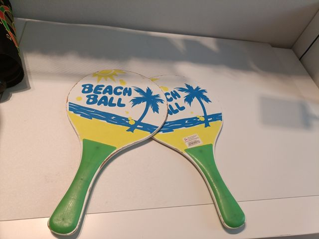 Set de dos palas para jugar en la playa con diseño veraniego. - Diseño Beach Ball con palmeras y sol. - Mangos de color verde.
