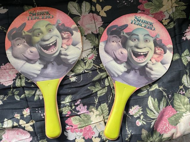 Detalles del productoPareja de raquetas de playa de madera con imágenes de Shrek Tercero. Son de color verde y rosa. Ideales para jugar en la playa o piscina. ( Sin pelota)