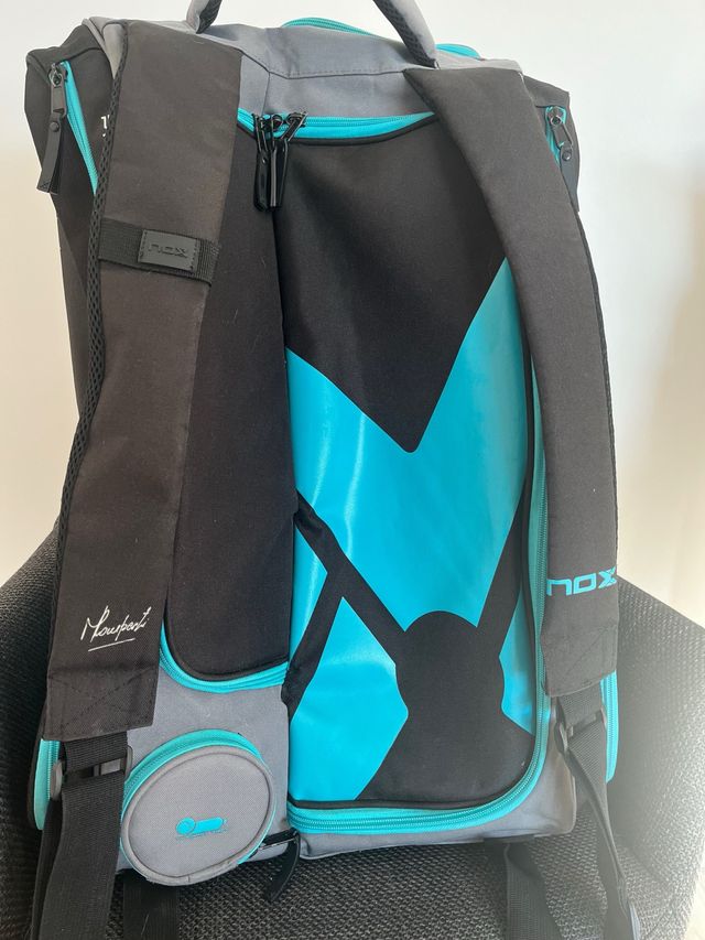 Detalles del productoPaletero de pádel NOX, modelo de Miguel Lamperti. Diseño moderno en gris, negro y azul.