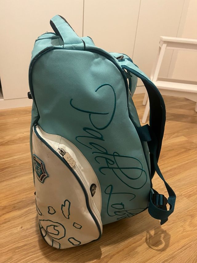 Paletero de pádel de la marca Padel Lobb en color azul verdoso y blanco estilo retro.