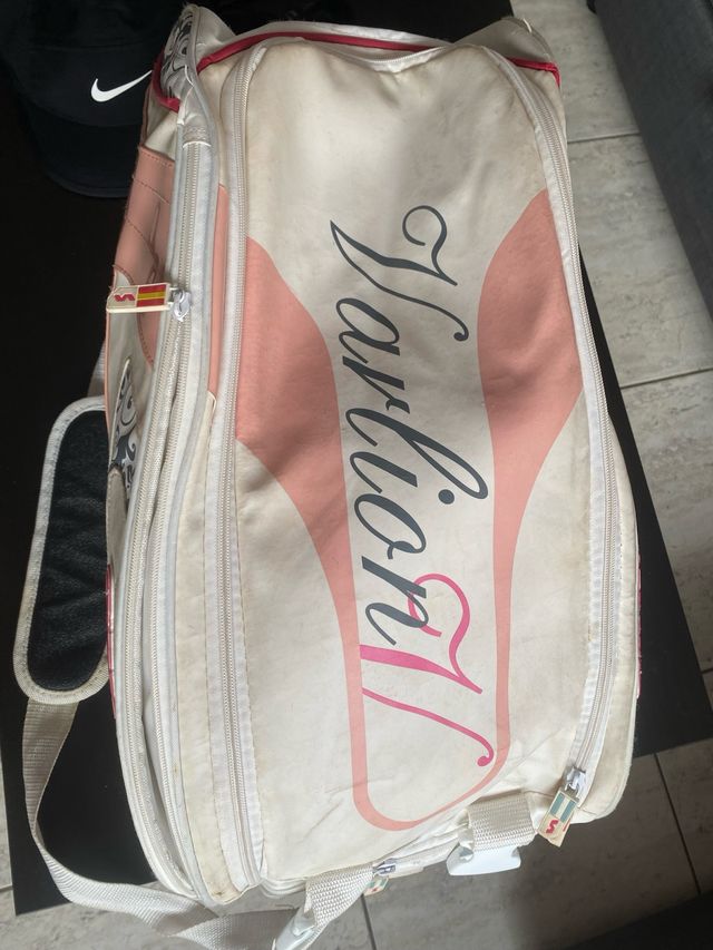 Detalles del productoPaletero de pádel de la marca Varlion, con un diseño en color blanco y detalles en rosa.