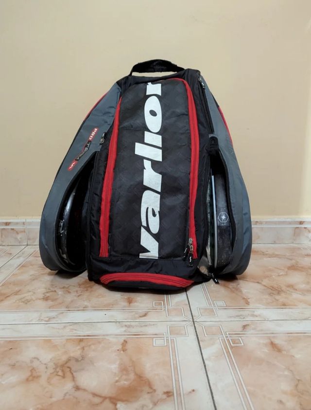 Paletero de pádel de la marca Varlion. - Diseño en color negro, gris y rojo. - Compartimentos para palas y accesorios.