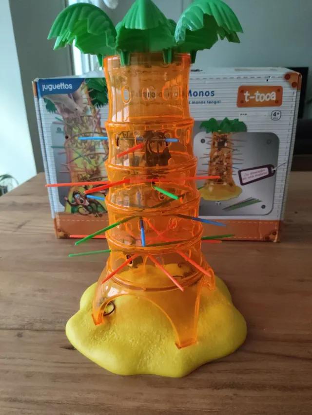 Juego de mesa Palmera de Monos. - Torre de plástico naranja. - Base amarilla. - Incluye palitos de colores (rojo, azul, verde). - Figuras de monos en el interior.