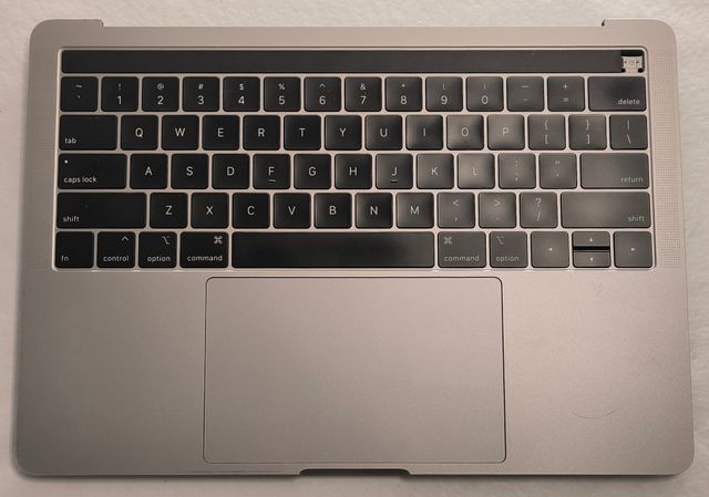 Detalles del productoVendo reposamanos con teclado y touchbar de un Macbook Pro a1989 de 13". Compatible con Macbooks Pro a1989 de 2018 y 2019. Color gris espacial. Batería, altavoces, ventiladores... incluidos. Trackpad no incluido en el precio.