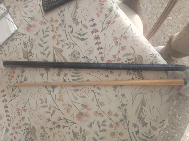 Palo de billar de madera, ideal para partidas. - Diseño elegante y clásico. - Mango negro con detalles azules. - Punta de color claro.