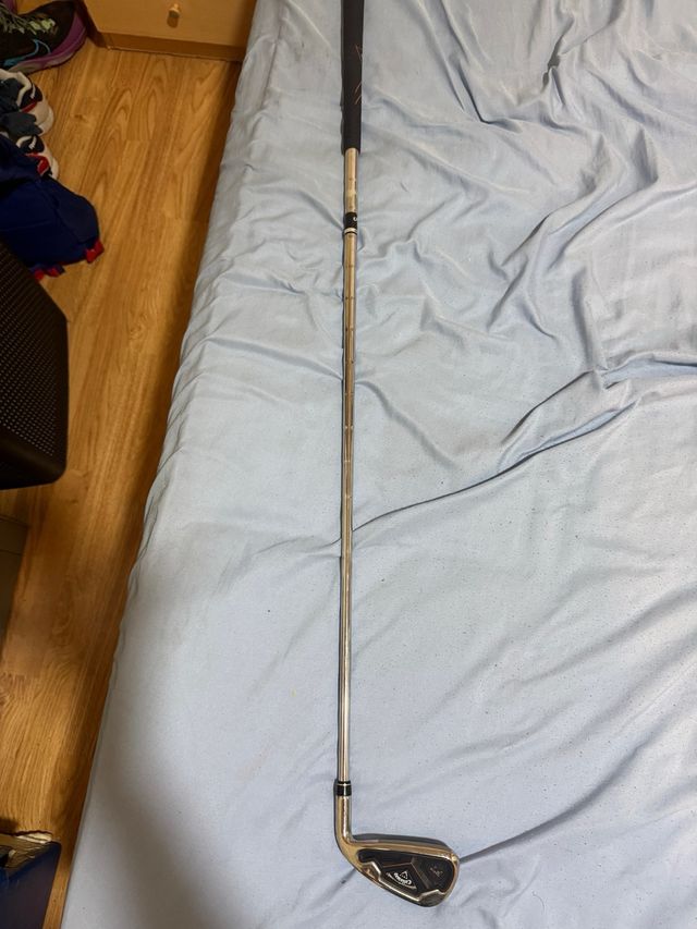 Palo de golf Callaway con mango negro. - Varilla metálica. - Cabeza del palo con detalles. - Mango con textura para mejor agarre.