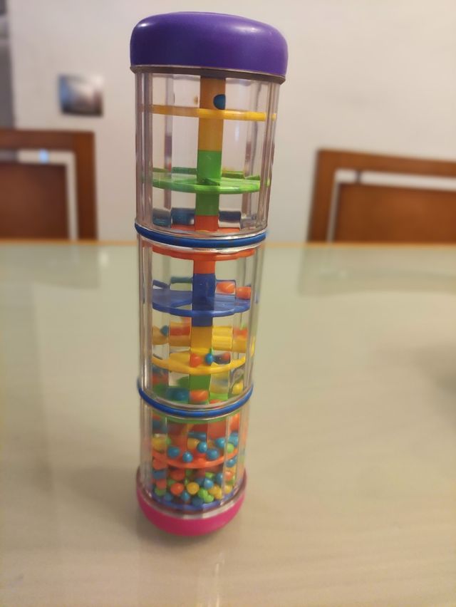 Juguete sensorial para bebés +6meses, conocido como Palo de lluvia. Otros juguetes para bebés +6meses por 5eur, los 3 por 12eur.