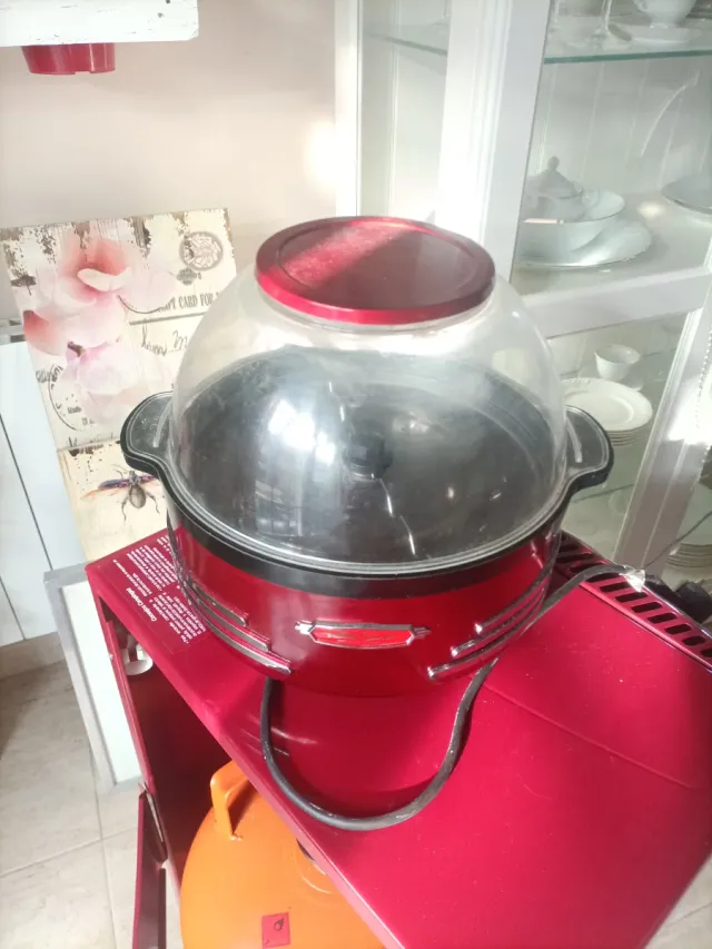 Palomitera Vintage con un diseño retro en color rojo y tapa transparente. - Base y estructura en color rojo. - Tapa de plástico transparente. - Asa en la tapa.