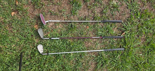 Detalles del productoConjunto de palos de golf diseñados para mujeres. Incluye un putter, un hierro y un wedge.