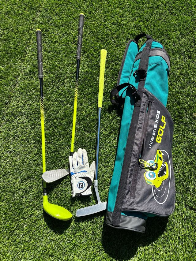 Detalles del productoSet de palos de golf para niños diestros, ideal para edades de 5 a 7 años. Incluye varios palos y un guante.