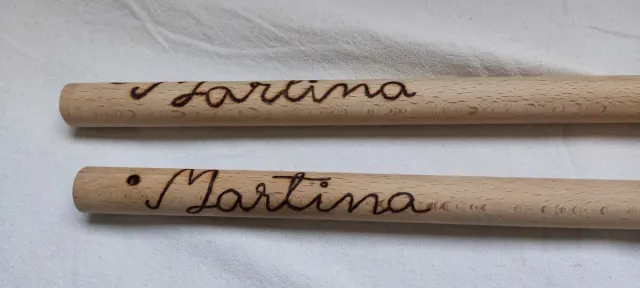 Dos palos de madera de haya, ideales para danza o paloteo. Cada palo tiene un nombre grabado. - Material: Madera de haya. - Grabado: Nombres personalizados.
