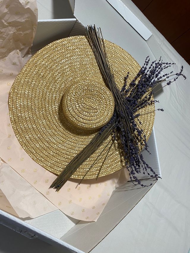 Pamela, elegante y con materiales naturales, flor color lavanda, usada solo en una ocasion, de la tienda Mariquita Trasquila.
