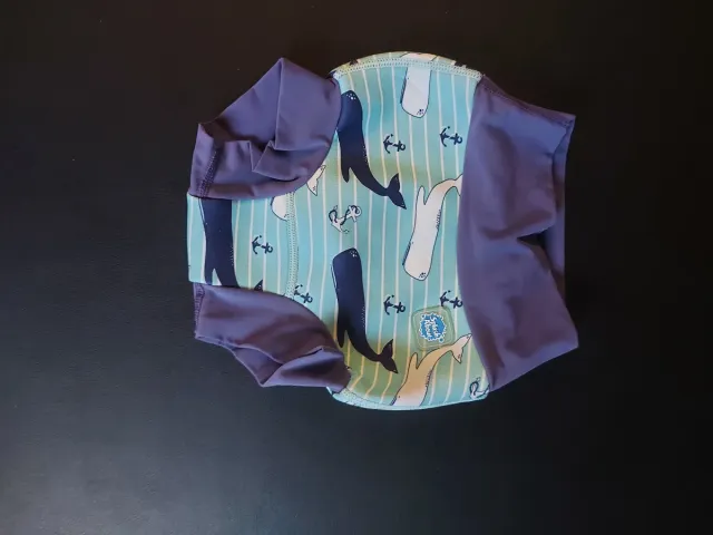 Detalles del productoPañal de natación con un divertido estampado de ballenas y anclas sobre fondo de rayas verticales en tonos turquesa y blanco. Las mangas y los laterales son elásticos para un ajuste perfecto.