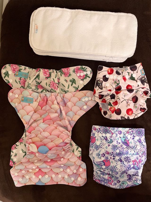 Detalles del productoLote de pañales de tela reutilizables y ecológicos con coloridos diseños.