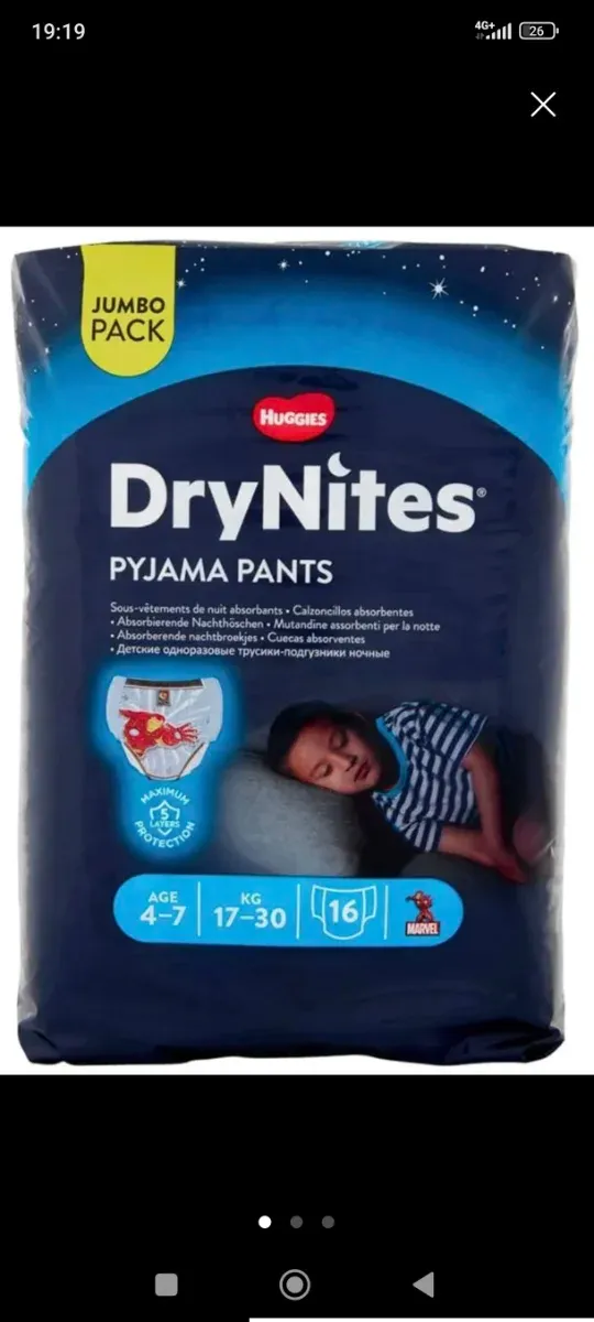 Detalles del productoPaquete de pañales Huggies Dry Nites para niños.