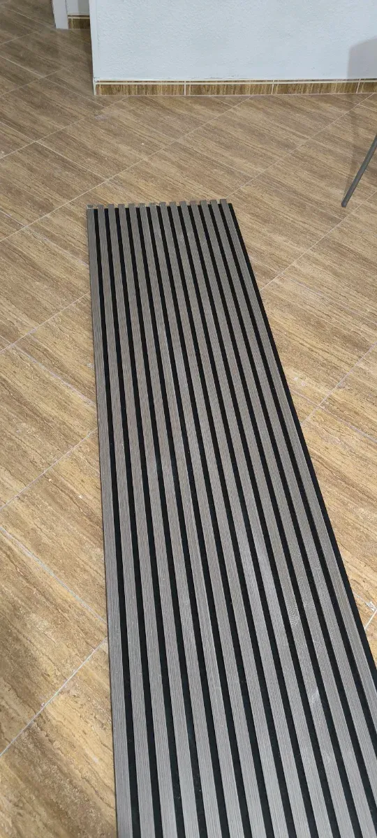Detalles del productoPanel acústico con diseño de lamas verticales en gris y negro. Ideal para mejorar la sonoridad de espacios.