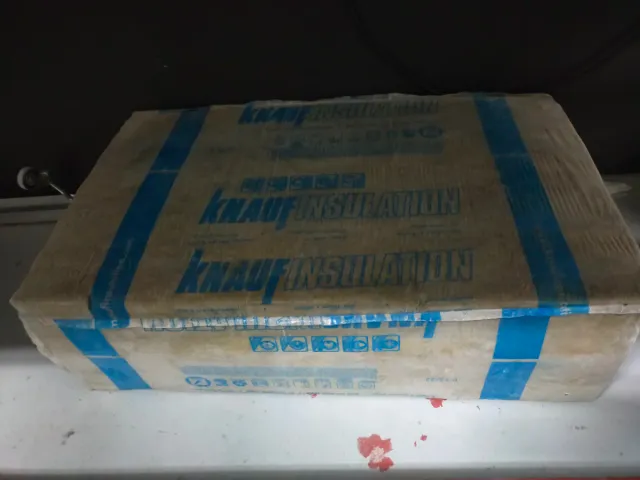 Panel de aislamiento térmico y acústico de la marca Knauf Insulation. - Material de aislamiento. - Cinta azul de embalaje. - Logotipo de la marca visible.