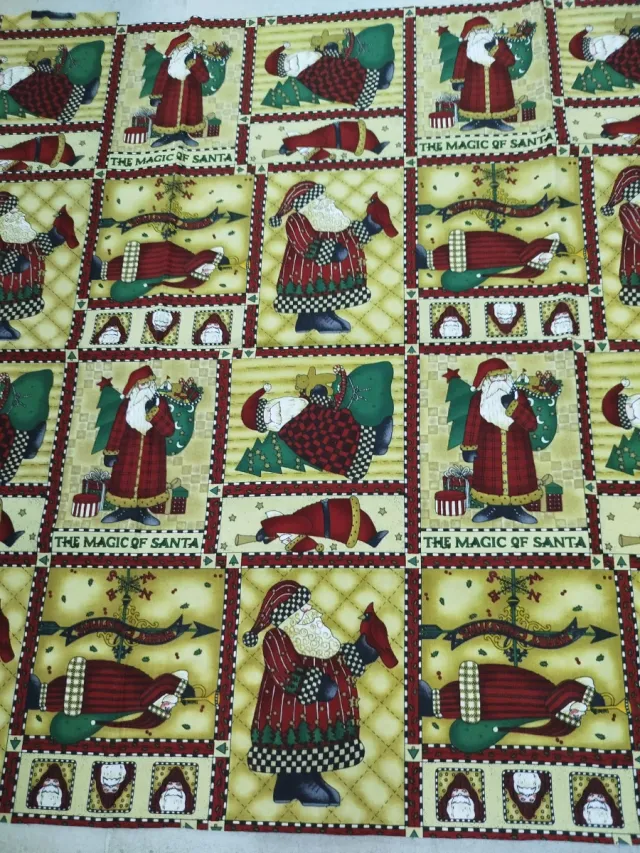 Panel de tela con diseño navideño de Santa Claus. Medidas 86x60 cms - Estampado de Santa Claus en diferentes escenas. - Texto The Magic of Santa repetido.