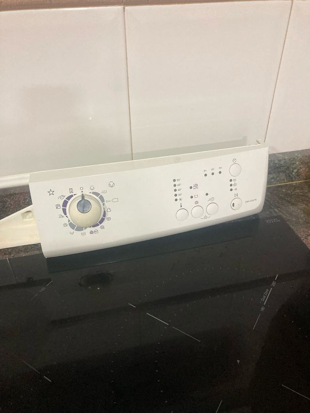 Detalles del productoPanel frontal con dial y botones, junto con la placa electrónica trasera de una lavadora.