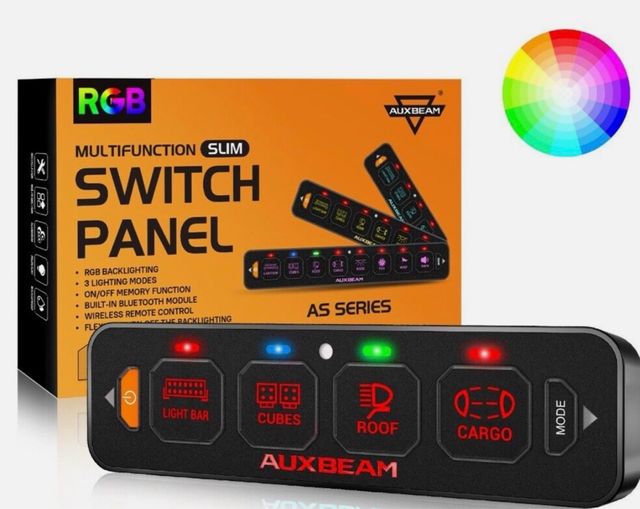 Detalles del productoPanel de interruptores multifunción AUXBEAM con retroiluminación RGB y módulo Bluetooth integrado.