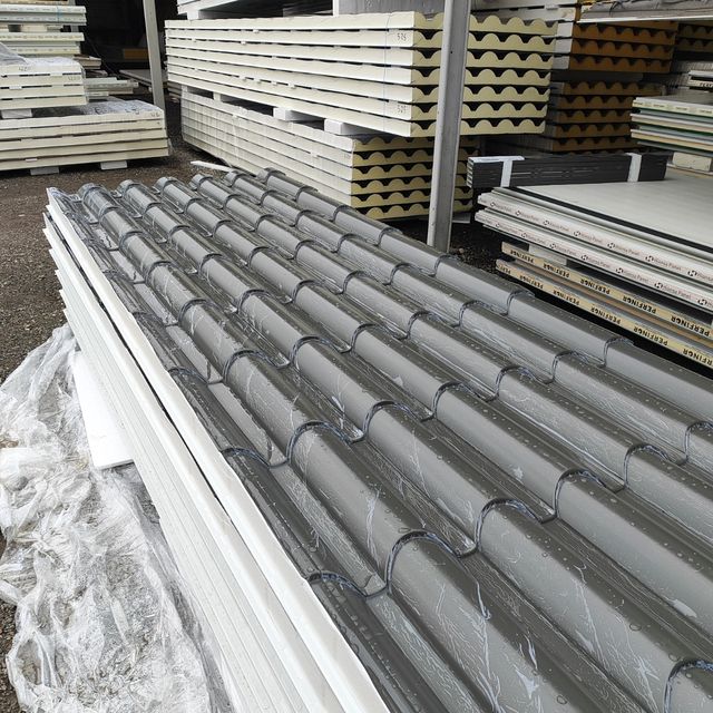 Panel sándwich con acabado imitación teja . Ideal para cubiertas. - Acabado imitación teja. - Color gris. - Material de alta calidad.