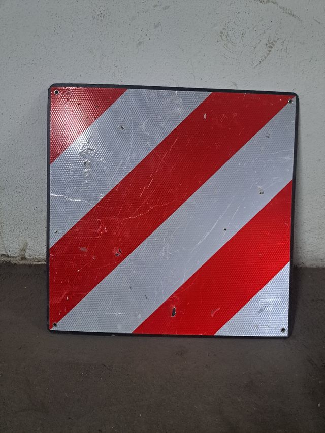 Detalles del productoPanel de señalización con franjas rojas y plateadas reflectantes.