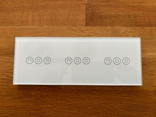 Panel de control Bseed para persianas con tres interruptores. - Diseño moderno y minimalista. - Acabado en cristal blanco. - Tres botones circulares con iconos.
