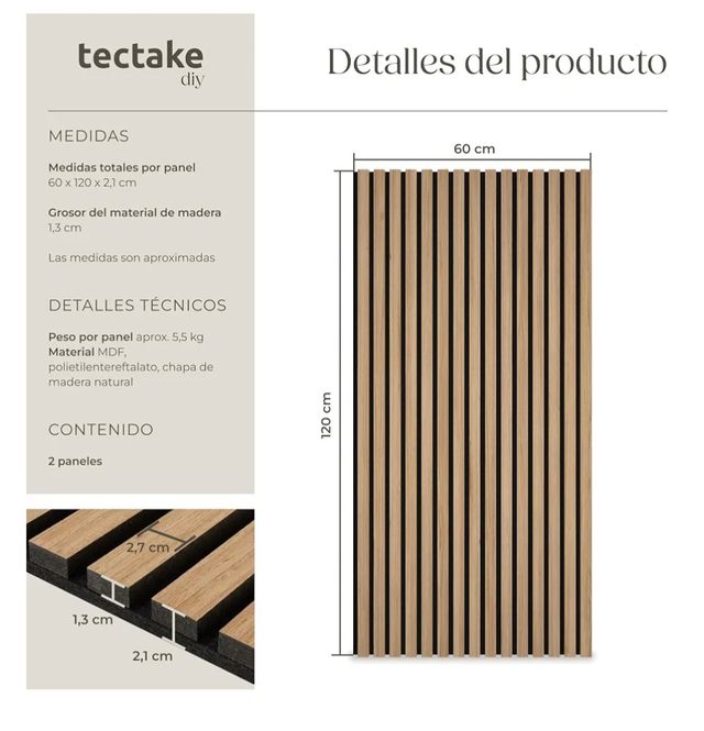 - Medidas totales por panel: 60 x 120 x 2,1 cm.