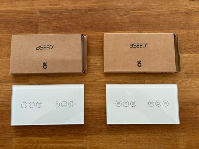 Detalles del productoSe venden dos paneles táctiles de persiana Bseed. Son de cristal blanco y cuentan con botones con iconos. Se venden juntos o por separado, 6€ la unidad.
