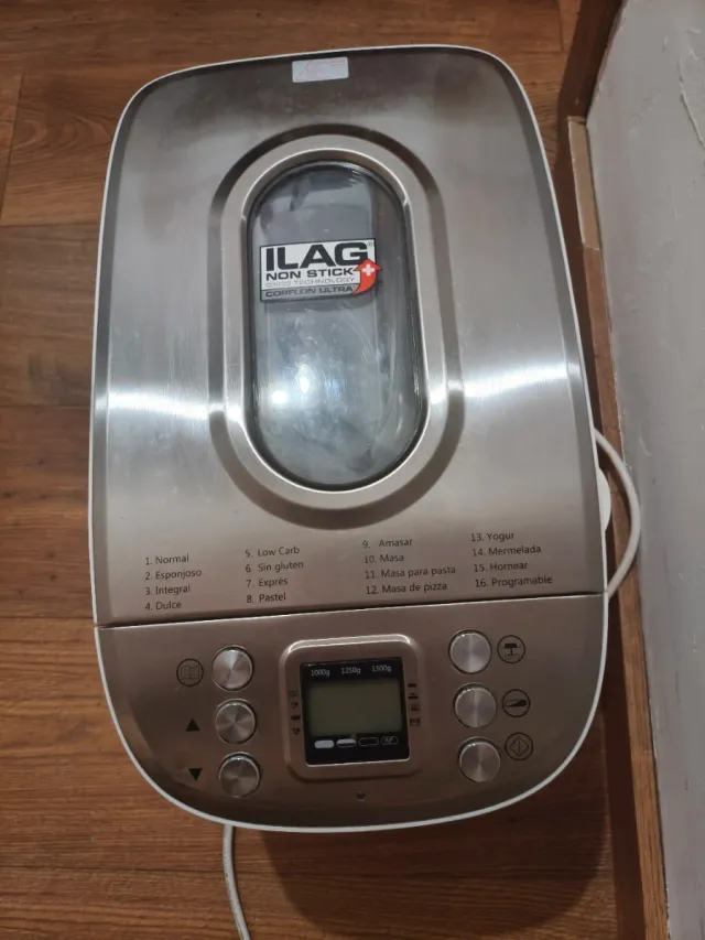 Panificadora ILAG con recubrimiento antiadherente Corflon Ultra. - 16 programas preestablecidos. - Pantalla digital. - Capacidad de 1000g, 1250g y 1500g.
