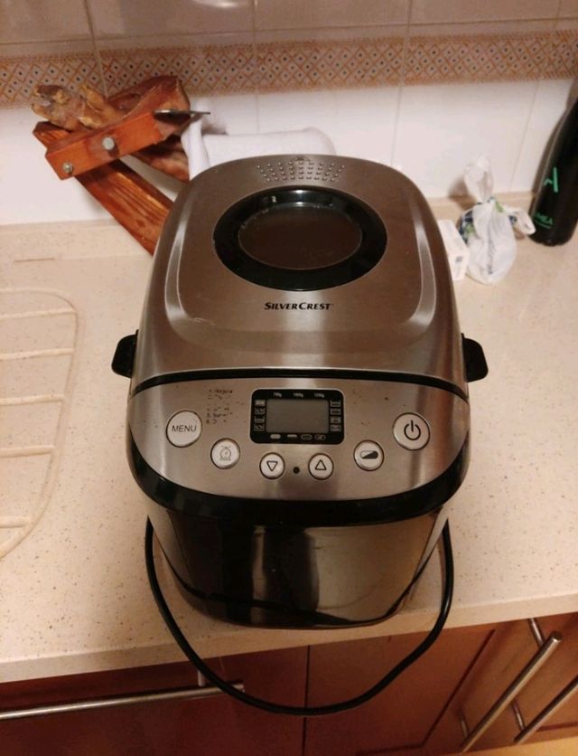 Detalles del productoPanificadora lidl marca silvercrest en perfecto estado, usada dos veces. El único desperfecto (se ve en las fotos) es que los números de los programas se han borrado un poco, pero aparecen también en el manual de uso, por lo que no es ningún problema para usarla. Muy cuidada. Incluye la panificadora, el manual de uso y su libro de recetas