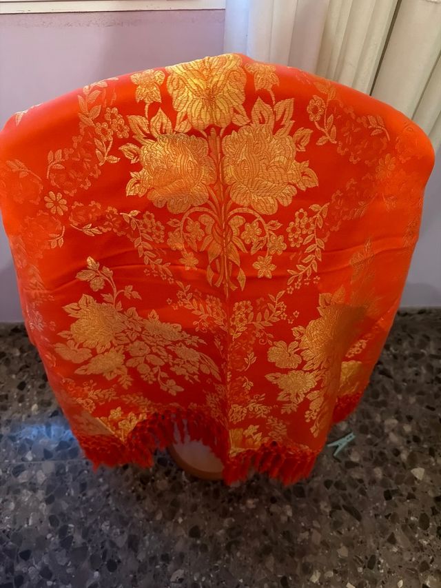 Precioso pañolón fallero con un diseño floral muy elaborado. - Bordado con hilo dorado. - Flecos en el borde.