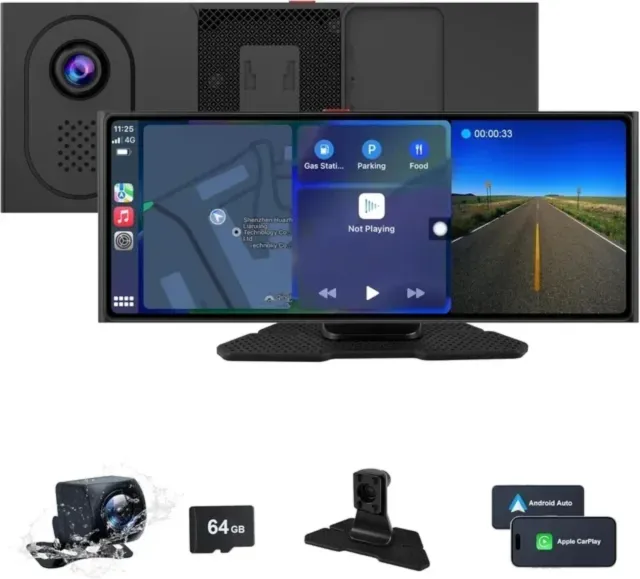 Detalles del productoPantalla de coche de 10" con todo lo necesario para su instalación con soporte autoadhesivo. Compatible con Apple Carplay y Android Auto. Permite llamadas, música, GPS, control inteligente por voz, mirrorlink, control automático del brillo y función de pantalla dividida... Posibilidad de conexión con el coche mediante Bluetooth, cable AUX, emisión FM o directamente a través de su altavoz integrado.El pack incluye la pantalla de 10" con cámara delantera integrada, coporte con varios adhesivos, cámara trasera impermeable para aparcamiento, cable de audio jack, micro SD de 64Gb, cable mechero-tipo C y herramientas para instalación