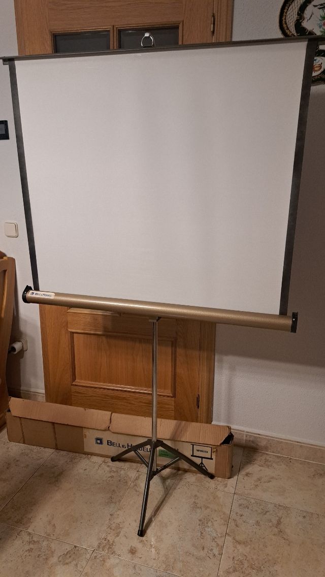 Detalles del producto📽️ Pantalla proyección vintage Bell & Howell original con trípode – 95 cm de ancho y altura regulable hasta 140 cm aprox.