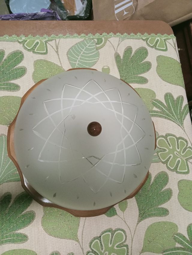 Detalles del productoPantalla de lámpara de techo con un diseño grabado en la superficie. El borde es de madera.