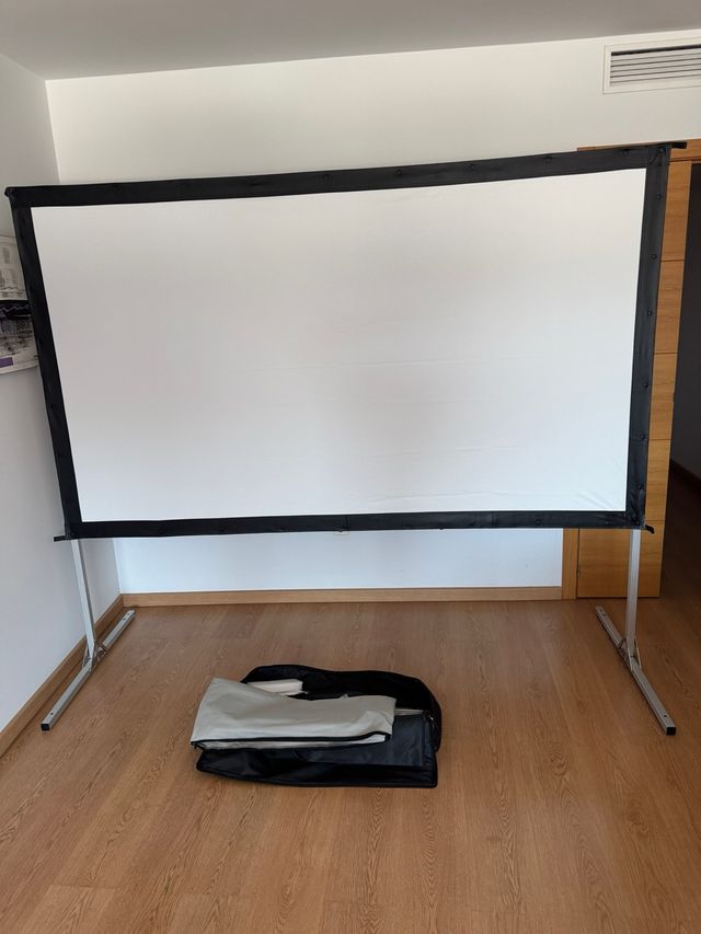 Detalles del productoPantalla de proyección Elite Screens de 100 pulgadas, modelo Yard Master 2, 16:9 (marca alemana). El marco es de aluminio, ligero, muy fácil de montar sin herramientas y bastante estable. Para la foto lo monté yo solo en menos de 10 minutos. En la foto salgo yo como referencia, mido 1,80.
