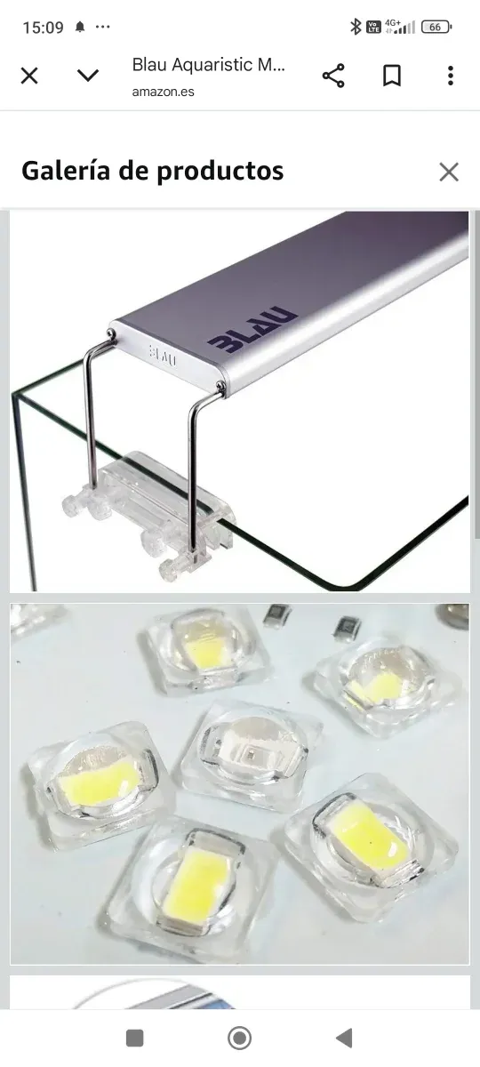 Detalles del productoPantalla LED de la marca Blau Aquaristic, diseñada para acuarios. El diseño es plateado y minimalista, con soportes para colocarla sobre el borde del cristal.