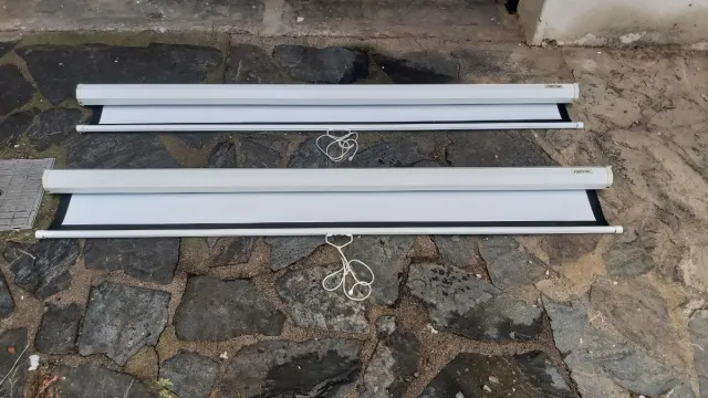 Pantalla de proyección enrollable para montaje en techo o pared. Ideal para presentaciones o cine en casa. - Carcasa blanca. - Superficie de proyección blanca.